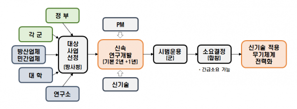 신속연구개발사업은 공모를 통해 대상사업을 선정해, 신기술이 적용된 무기체계를 최대 3년 이내의 기간 동안 신속하게 연구개발하게 된다.