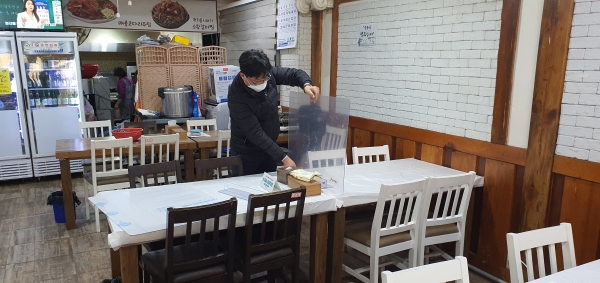 [한국Q뉴스] 군산시가 음식점 대상 비말차단 테이블 칸막이 설치 지원으로 음식점 내 코로나19 감염확산을 막기 위해 총력을 기울이고 있다.