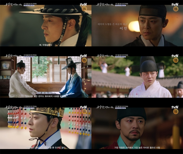 다정히 바둑을 두던 진한대군과 내기 바둑꾼 강희수의 관계는 이인이 용상에 오른 후 완전히 달라졌고 임금이 된 후 다시 만난 두 사람 사이의 공기는 차갑게 바뀌었지만 미묘한 기류는 계속돼 두 사람의 관계성을 향한 궁금증이 더해진 것. 특히 “너는 내가 싫다”라 낮게 읊조리는 이인에게 강희수가 “아니다”라 답하자 곧바로 “그럼 좋으냐”라 되묻는 아슬아슬한 텐션은 설렘을 유발, 조정석의 나른한 듯 섬세한 목소리 톤은 설렘 포인트를 극대화하며 달지만 씁쓸한 두 사람의 애증의 멜로가 어떻게 펼쳐질지 호기심을 치솟게 한다.