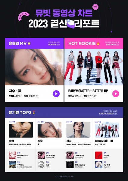 해당 리포트를 통해 뮤빗은 2023년 최고 조회 수를 기록한 뮤직비디오를 ‘올해의 MV’ 부문에, 2023년 데뷔한 신인 중 최고 조회 수를 기록한 아티스트를 ‘핫 루키’ 부문에 선정했다.