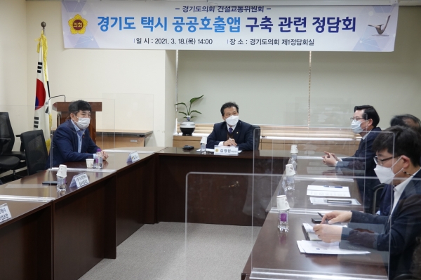 [한국Q뉴스] 경기도의회 건설교통위원회는 지난 18일 경기도의회 제1정담회실에서 경기도 교통국 택시교통과, 경기도 개인택시조합 및 법인택시조합 관계자들과 함께 ‘경기도 택시 공공호출앱’구축과 관해 논의하고자 정담회를 개최했다.