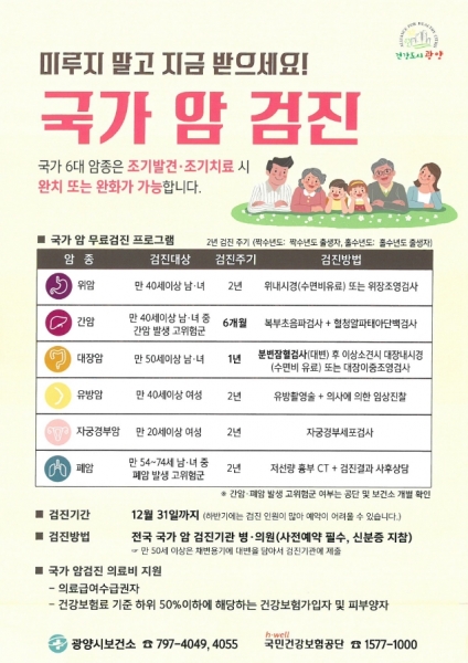 올해 국가암 검진 대상자는 홀수년도 출생자로 의료급여수급권자와 건강보험료 하위 50% 이하인 자이며 암종별 대상자 기준에 해당하면 무료검진이 가능하다.