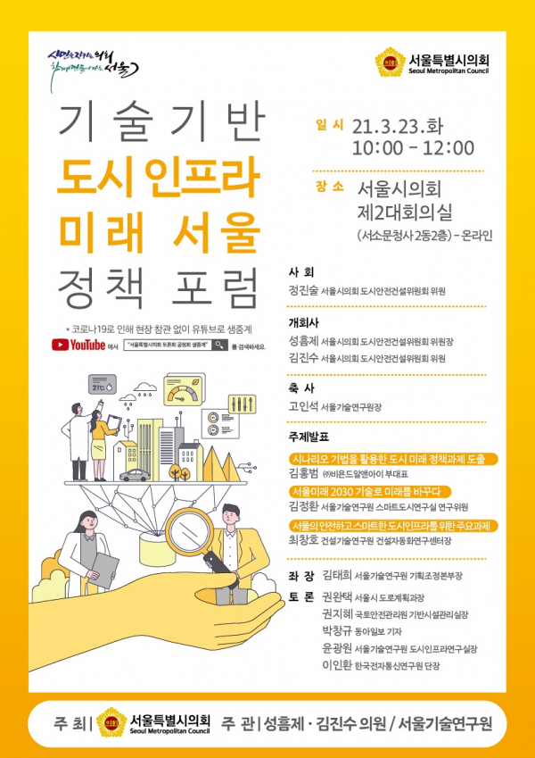 [한국Q뉴스] 서울특별시의회 도시안전건설위원회 성흠제 위원장과 김진수 의원이 서울기술연구원과 공동주관하는 ‘기술기반 도시 인프라 미래 서울 정책 포럼’이 오는 23일 오전 10시 서울시의회 제2대회실에서 무청중 온라인 방식으로 개최된다.