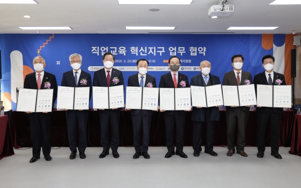 [한국Q뉴스] 충남교육청은 천안시, 천안시기업인연합회, 충남북부상공회의소, 한국기술교육대, 공주대, 백석대, 백석문화대와 23일 천안교육지원청에서 ‘직업교육 혁신지구’ 운영을 위한 업무협약을 맺었다.