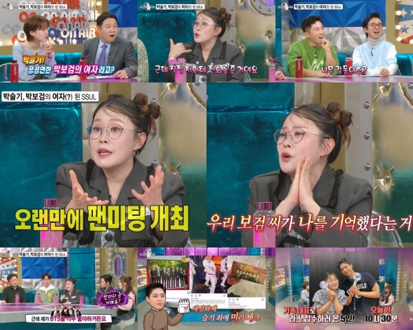MC 장도연은 “박슬기 씨가 공공연한 박보검의 여자라는데 이게 무슨 얘기죠?”고 질문했고 박슬기는 박보검 팬 미팅 전담 MC라는 사실과 함께 군 입대와 코로나19로 미뤄진 박보검의 팬 미팅 MC를 맡았을 당시 비하인드 스토리를 언급했다.