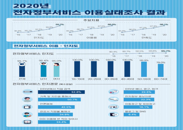 행정안전부는 2020년 전자정부 서비스의 인지도, 이용률, 만족도 등을 조사한 이용실태 조사결과를 발표했다.