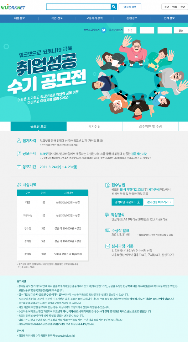 접수 기간은 3월 24일부터 4월 23일까지이며 워크넷을 통해 취업에 성공한 워크넷 회원이라면 누구나 참가할 수 있다.