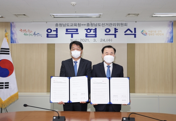 협약식은 충청남도선거관리위원회 상임위원과 충청남도교육감이 업무협약서에 서명한 후, 협약서를 교환하는 방식으로 진행됐다.