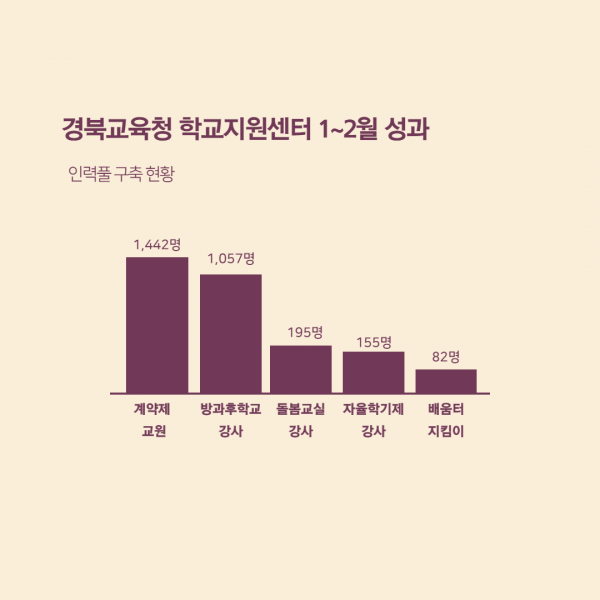 1∼2월 중 학교지원센터는 계약제 교원 채용 지원, 방과후학교 강사 선정 지원, 인력풀 구축 등의 학교 업무지원에 총력을 다했다.