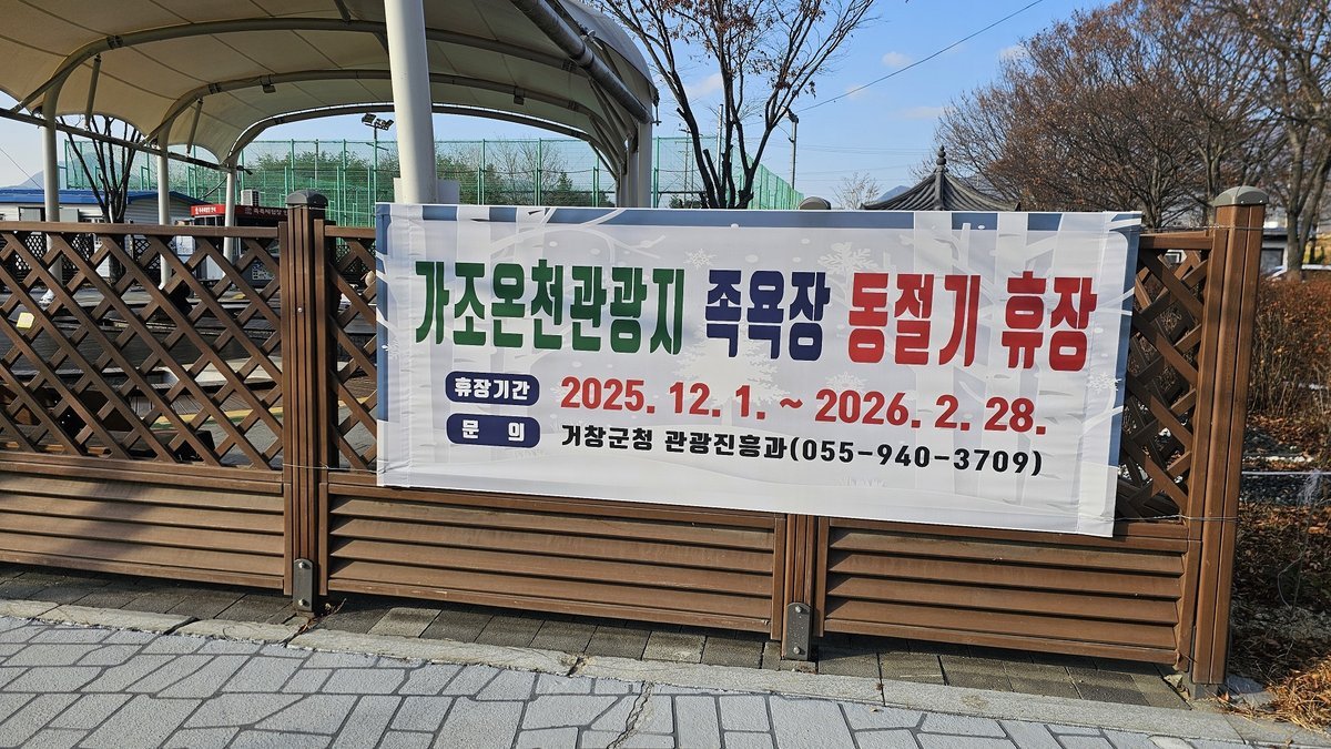 [한국Q뉴스] 거창군은 오는 12월 1일부터 내년 2월 말까지 가조온천관광지 입구에 있는 족욕체험장을 동절기 휴장한다고 밝혔다.
