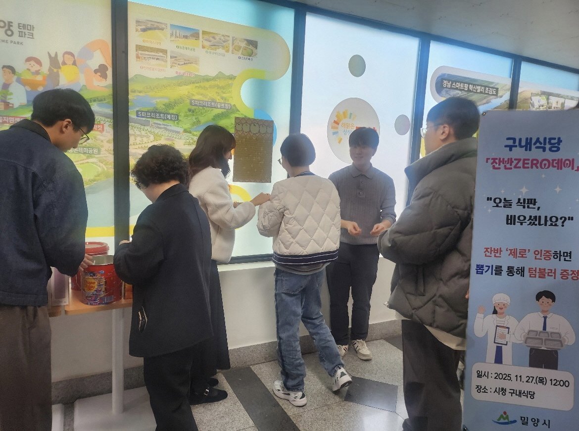[한국Q뉴스] 경남 밀양시는 27일 시청 구내식당에서 환경문제에 대한 인식을 높이고 탄소중립 실천 문화를 확산하기 위해 직원들을 대상으로 ‘잔반 없는 날’행사를 운영했다.