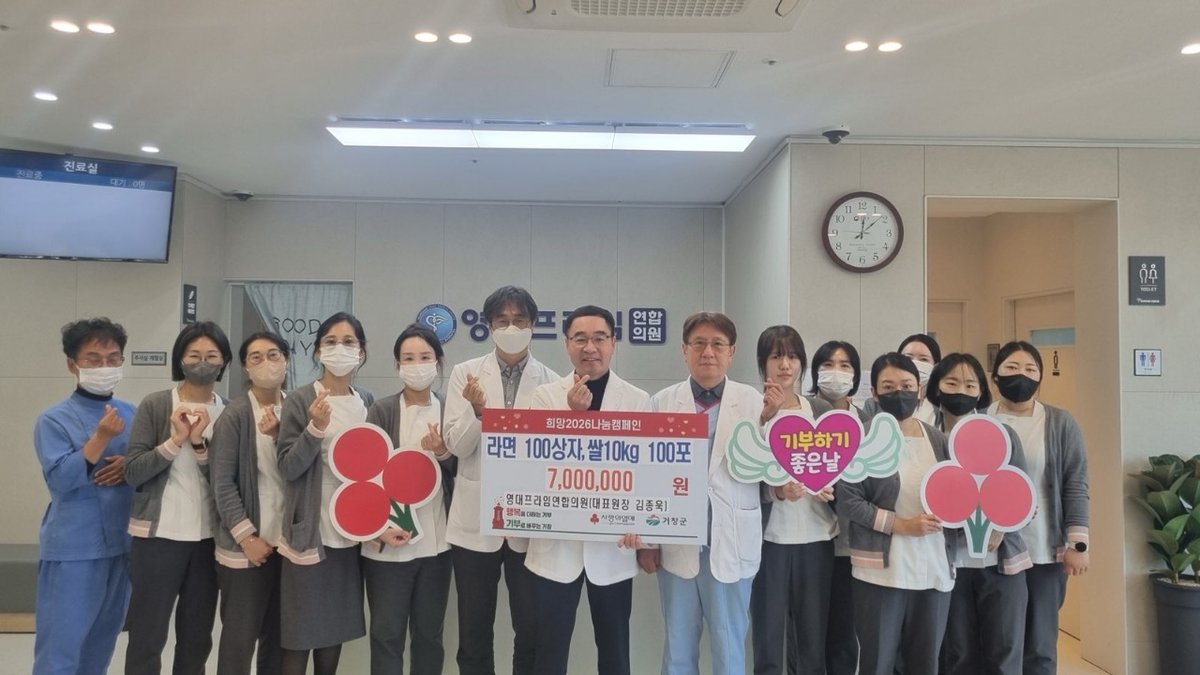 [한국Q뉴스] 거창군은 지난 1일 영대프라임연합의원이 지역의 어려운 이웃을 위해 700만 원 상당의 쌀과 라면을 기부하며 훈훈한 나눔을 실천했다고 밝혔다.