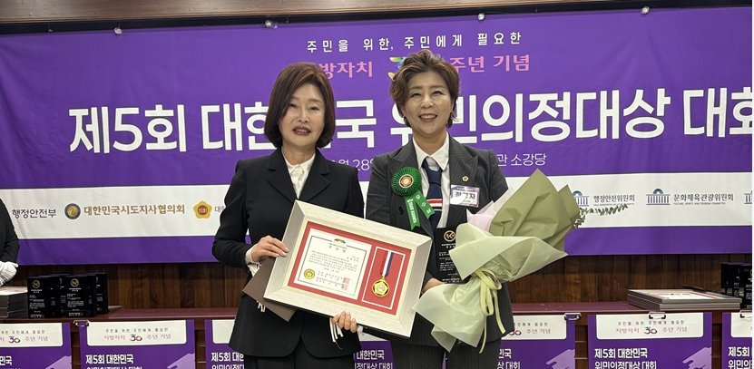 [한국Q뉴스] 경기도의회 정경자 의원이 지난 28일 제5회 대한민국 위민의정대상에서 우수상과 국회행정안전위원장상을 동시에 수상하며, 지방의정 분야에서 주목할 만한 성과를 올렸다.
