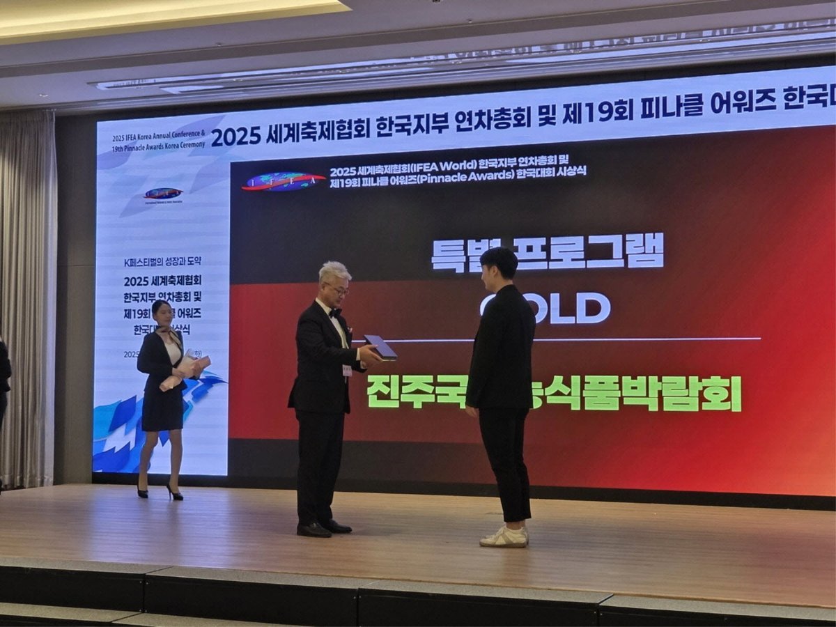 진주시는 1일 충남 부여군에서 열린 ‘2025 아시아 피너클 어워드’에서 ‘2025 진주국제농식품박람회’가 특별 프로그램 부문에서 금상을 수상했다고 밝혔다.