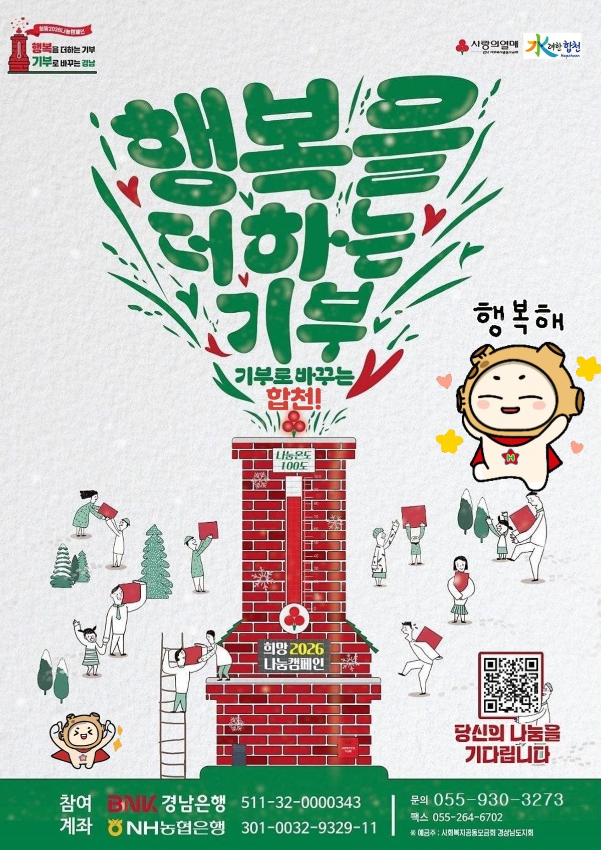 경남사회복지공동모금회가 주최하고 합천군이 후원하는 「희망2026나눔캠페인」은 어려운 이웃들에게 사랑을 전하기 위한 연말연시 대표적인 나눔 캠페인으로, 올해는 ‘행복을 더하는 기부, 기부로 바꾸는 합천!’이라는 슬로건으로 펼쳐진다.