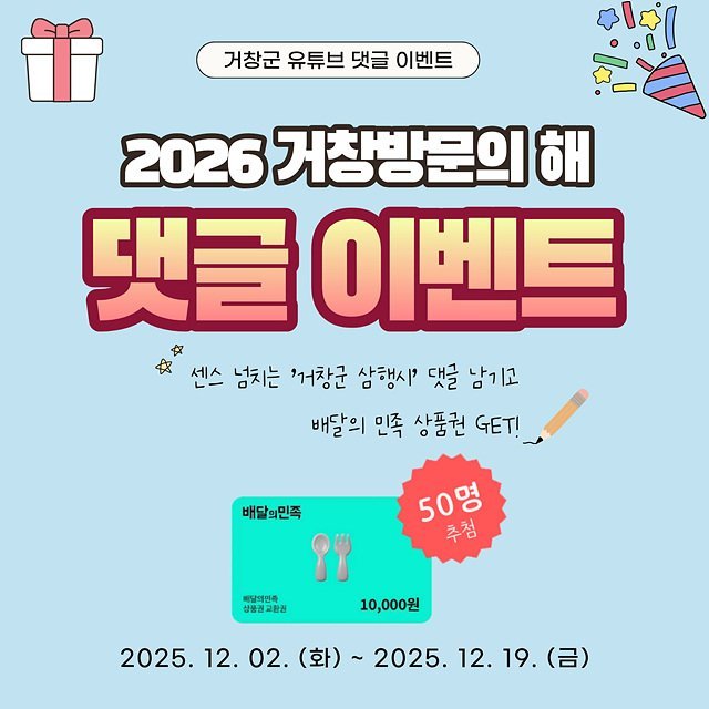 이번 이벤트는 거창군의 관광지 홍보와 소셜미디어 활성화를 위해 마련된 것으로, 지난 11월 ‘거창한 거창하게’영상 공모전에 선정된 일반영상과 쇼츠 16편이 새롭게 순차적으로 게시될 예정으로 구독자 참여와 콘텐츠 확산이 기대된다.