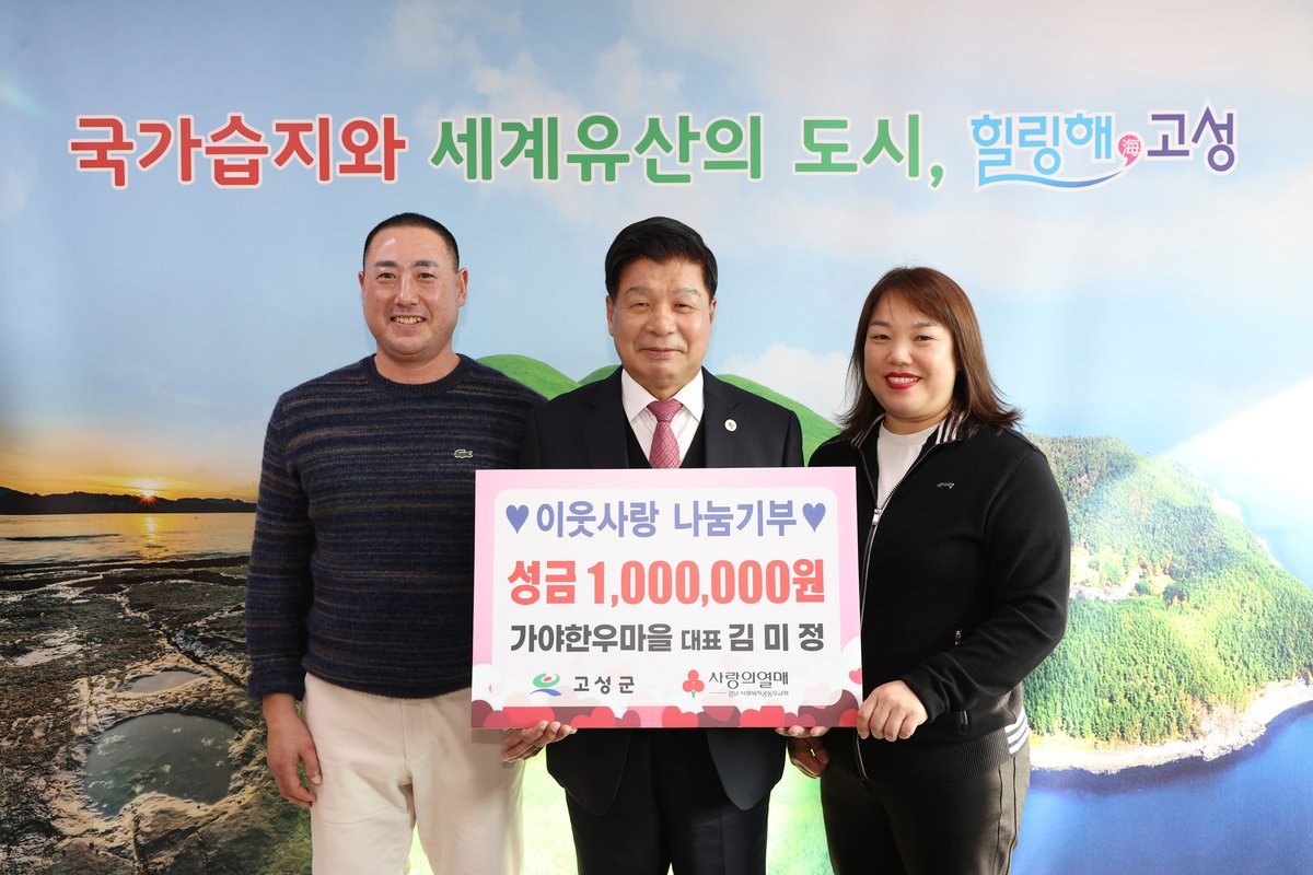 [한국Q뉴스] 고성군은 가야한우마을 김미정 대표가 12월 2일, 고성군청을 방문하여 어려운 이웃들을 위해 성금 100만 원을 기탁했다고 밝혔다.