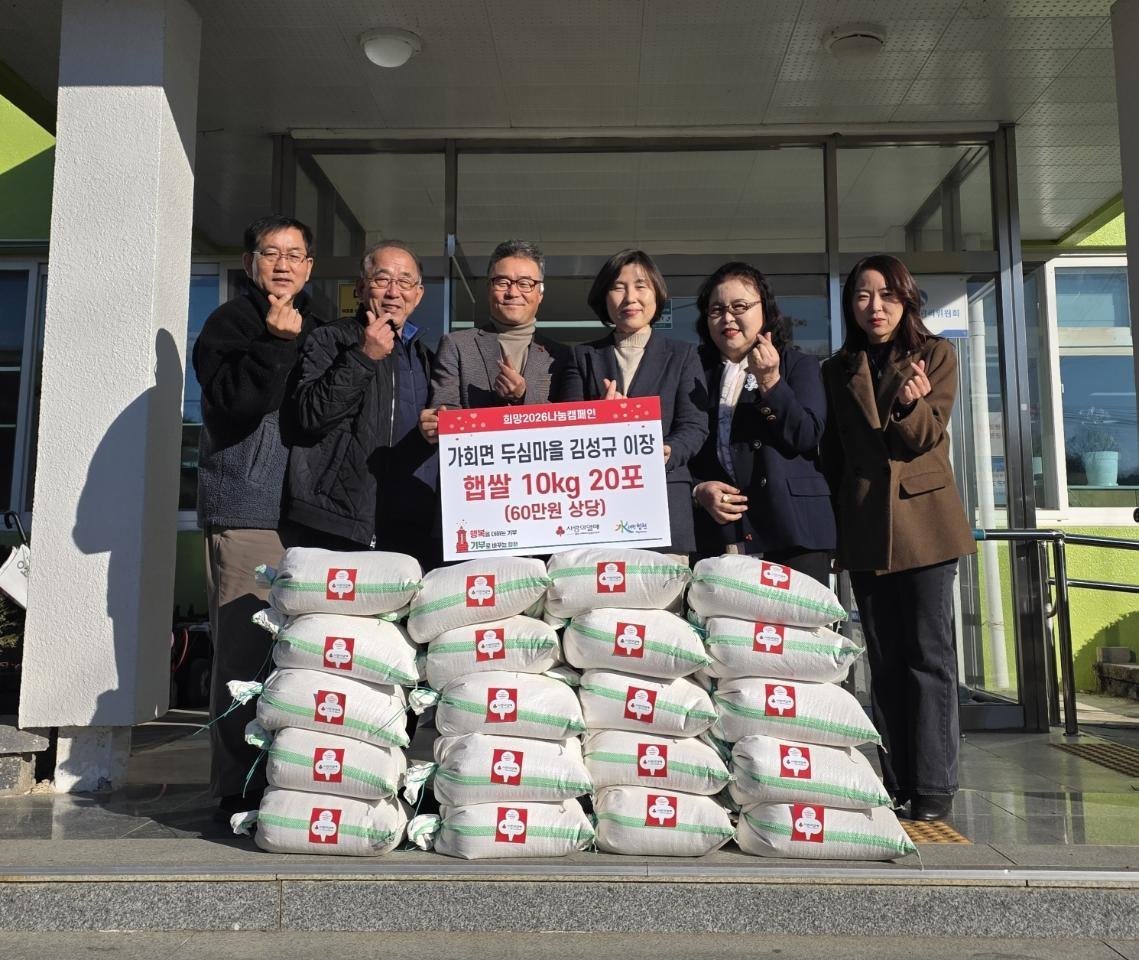 김성규 이장은 가회면이 고향으로 평소 남다른 애향심과 봉사심으로 두심마을 주민을 살뜰히 챙겨보는 이장님으로 “직접 농사지은 햅쌀을 우리 지역의 소외계층을 돕는데 보탤 수 있어 기쁘게 생각한다”고 기탁 소감을 밝혔으며,조홍숙 가회면장은 “어려운 이웃을 위해 나눔해 주시는 이장님께 깊은 감사를 드린다, 전달받은 햅쌀은 도움이 필요한 어려운 이웃들에게 잘 전달하겠다”고 고마움을 표했다.