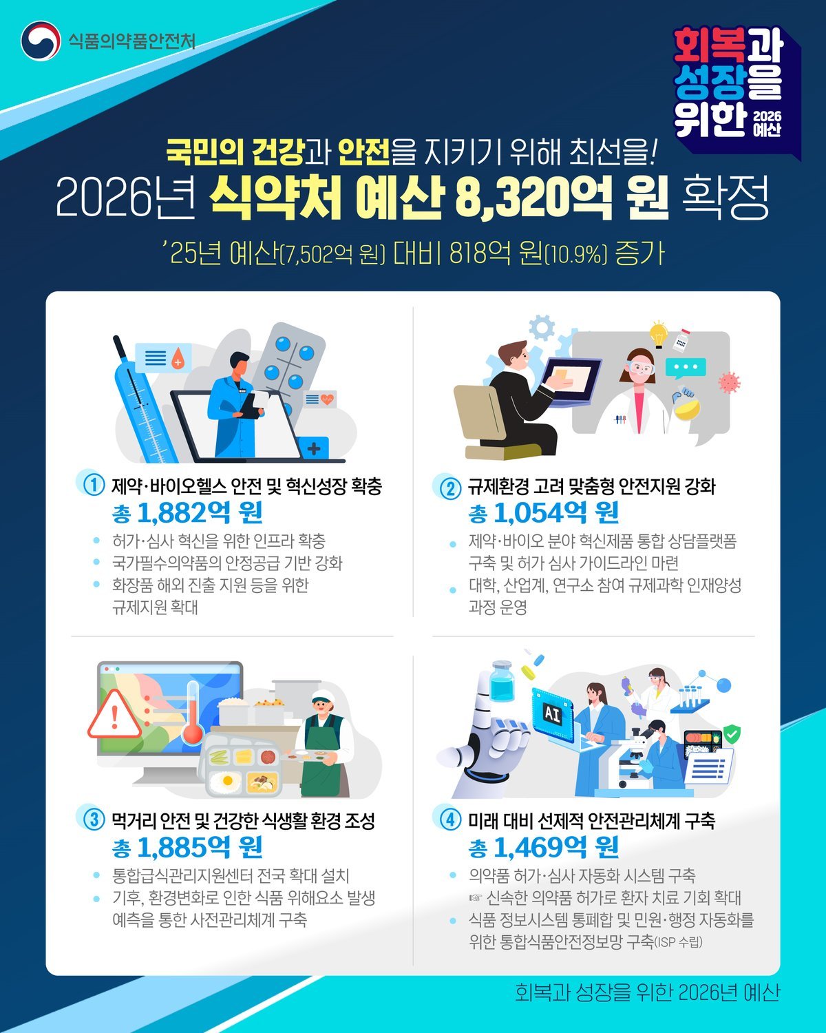[한국Q뉴스] 식품의약품안전처는 2026년도 예산을 올해 대비 818억원 증가한 총 8,320억원으로 최종 확정했다고 밝혔다.