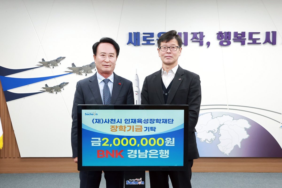 [한국Q뉴스] BNK 경남은행이 지난 8일 사천시청을 방문해 사천시 인재육성장학재단에 장학금 200만 원을 기탁했다.