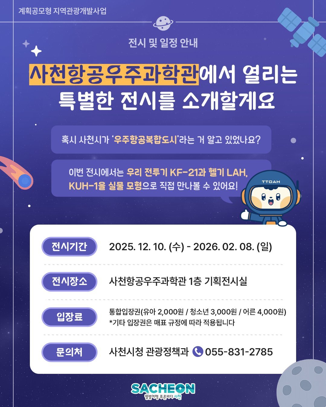 [한국Q뉴스] 사천시는 오는 12월 10일부터 2026년 2월 8일까지 사천항공우주과학관 1층 기획전시실에서 ‘하늘과 미래를 잇는 전시기획전’을 개최한다.
