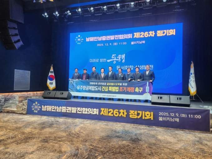 [한국Q뉴스] 남해안남중권발전협의회는 9일 개최된 제26차 정기회에서 ‘우주항공복합도시 건설 및 지원에 관한 특별법’의 조기 제정을 강력히 촉구했다.