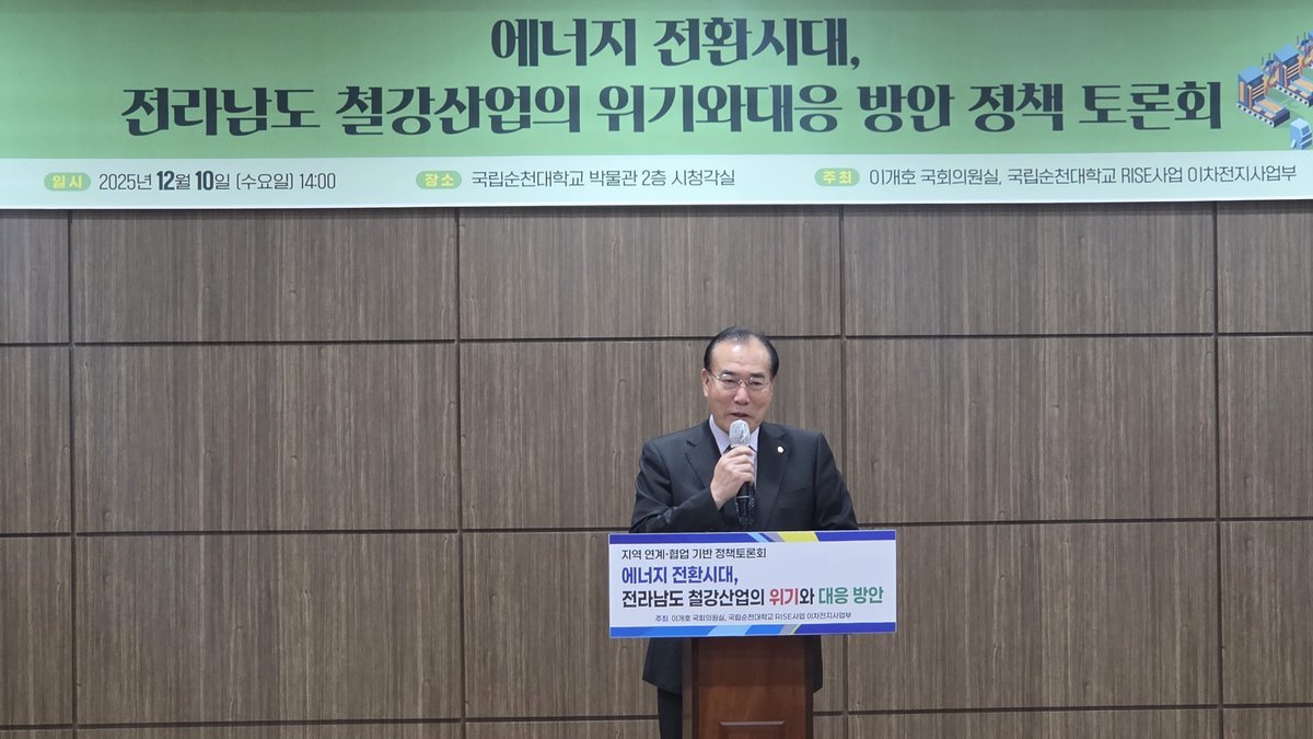 [한국Q뉴스] 이개호 국회의원실과 국립순천대학교는 10일 국립순천대 박물관 대회의실에서「에너지 전환시대, 전라남도 철강산업의 위기와 대응 방안」을 주제로 정책토론회를 공동 개최하고, 급변하는 산업환경 속에서 광양만권 철강산업이 나아가야 할 방향을 논의했다.