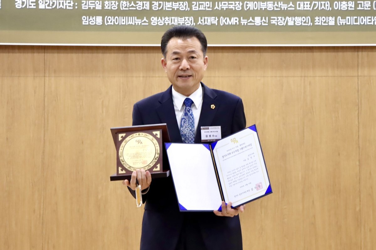[한국Q뉴스] 경기도의회 김성수 의원이 10일 경기도의회 대회의실에서 열린 ‘2025년 우수 의정·행정대상’시상식에서 우수의정대상을 받으며 민생 중심의 헌신적인 의정활동 성과를 인정받았다.