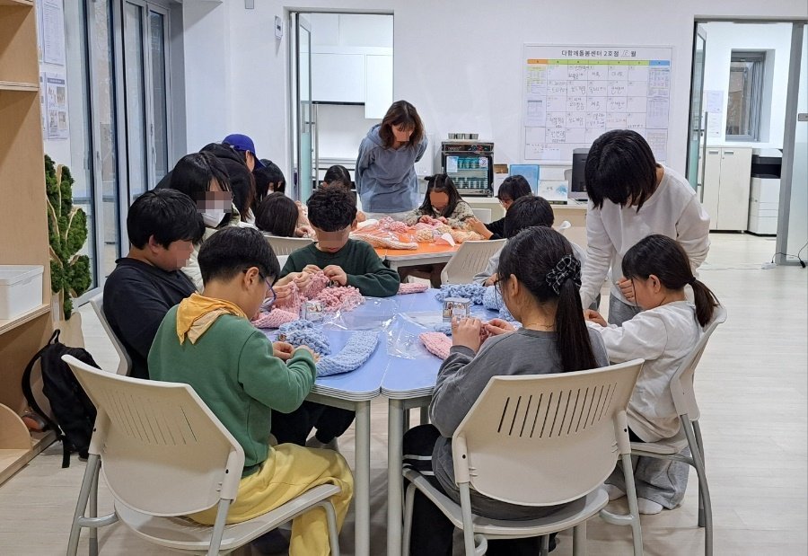 청소년들은 사전에 목도리 뜨는 방법을 배우고 연습한 후에, 다함께돌봄센터를 찾아 아이들에게 목도리 뜨는 방법을 알려주며 스스로 완성할 수 있도록 도왔다.