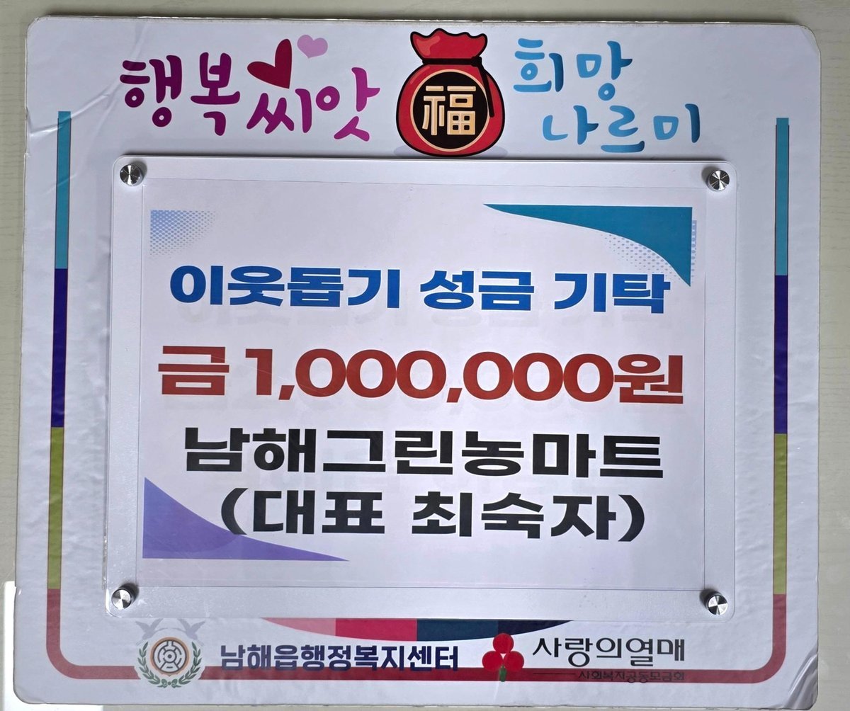 이창융 남해읍장은 “매년 잊지 않고 따뜻한 나눔을 실천해 주시는 남해그린농마트에 깊이 감사드린다”며 “기탁해 주신 성금은 도움이 필요한 이웃들에게 공정하고 투명하게 전달하겠다”고 말했다.