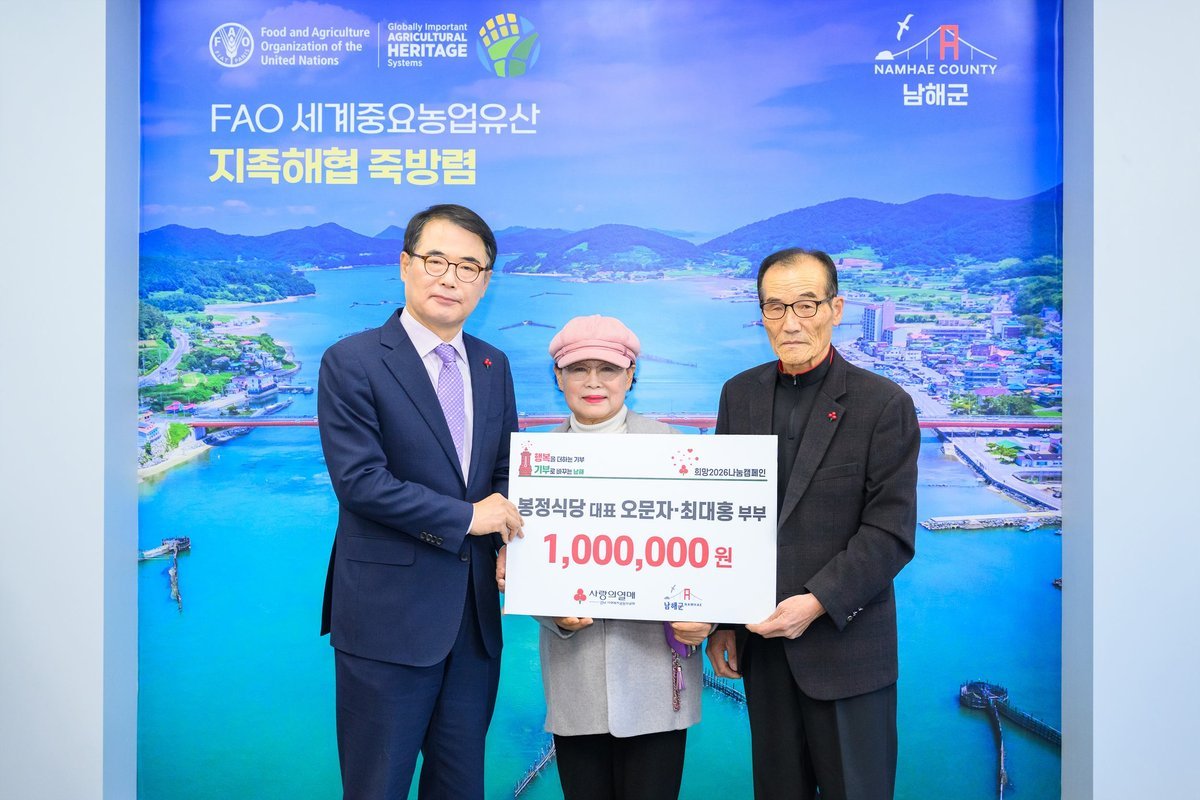 또한 남해읍 봉정식당을 운영 중인 오문자·최대홍 부부도 성금 100만 원을 기탁하며 이웃사랑을 실천했다.