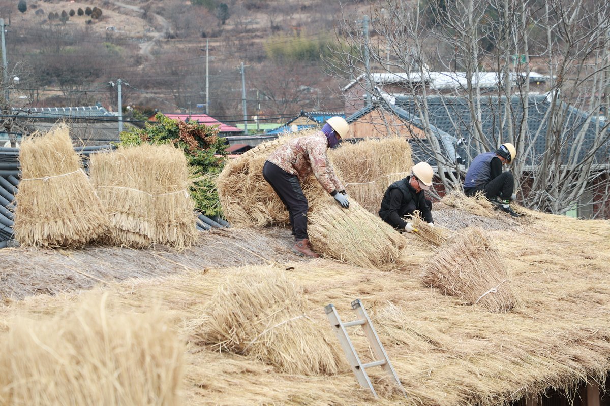 [한국Q뉴스] 경남 의령군 화정면에 위치한 창녕조씨 종가인 조씨 고가에서 16일 초가지붕을 새 볏짚으로 단장하는 이엉 잇기 작업이 한창 진행됐다.