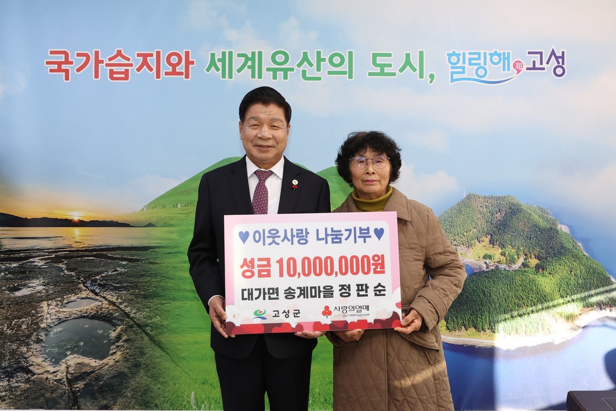 정판순 씨는 이날 고성군청을 직접 방문하여 어려운 여건 속에서 생활하고 있는 저소득층, 특히 폐지를 줍는 어르신들을 위한 나눔 실천의 뜻을 전했다.