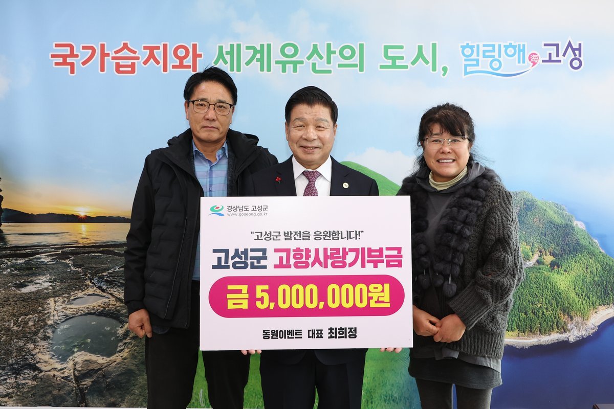 [한국Q뉴스] 고성군은 12월 17일, 이벤트·행사대행업체 동원이벤트의 최희정 대표가 고향사랑기부금 500만 원을 기탁했다고 밝혔다.