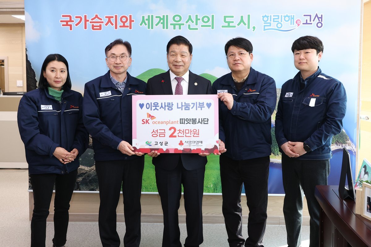 [한국Q뉴스] 고성군은 sk오션플랜트 띠앗봉사단이 12월 17일 고성군을 방문해 관내 저소득층 지원을 위한 이웃돕기 성금 2000만 원을 기탁했다고 밝혔다.