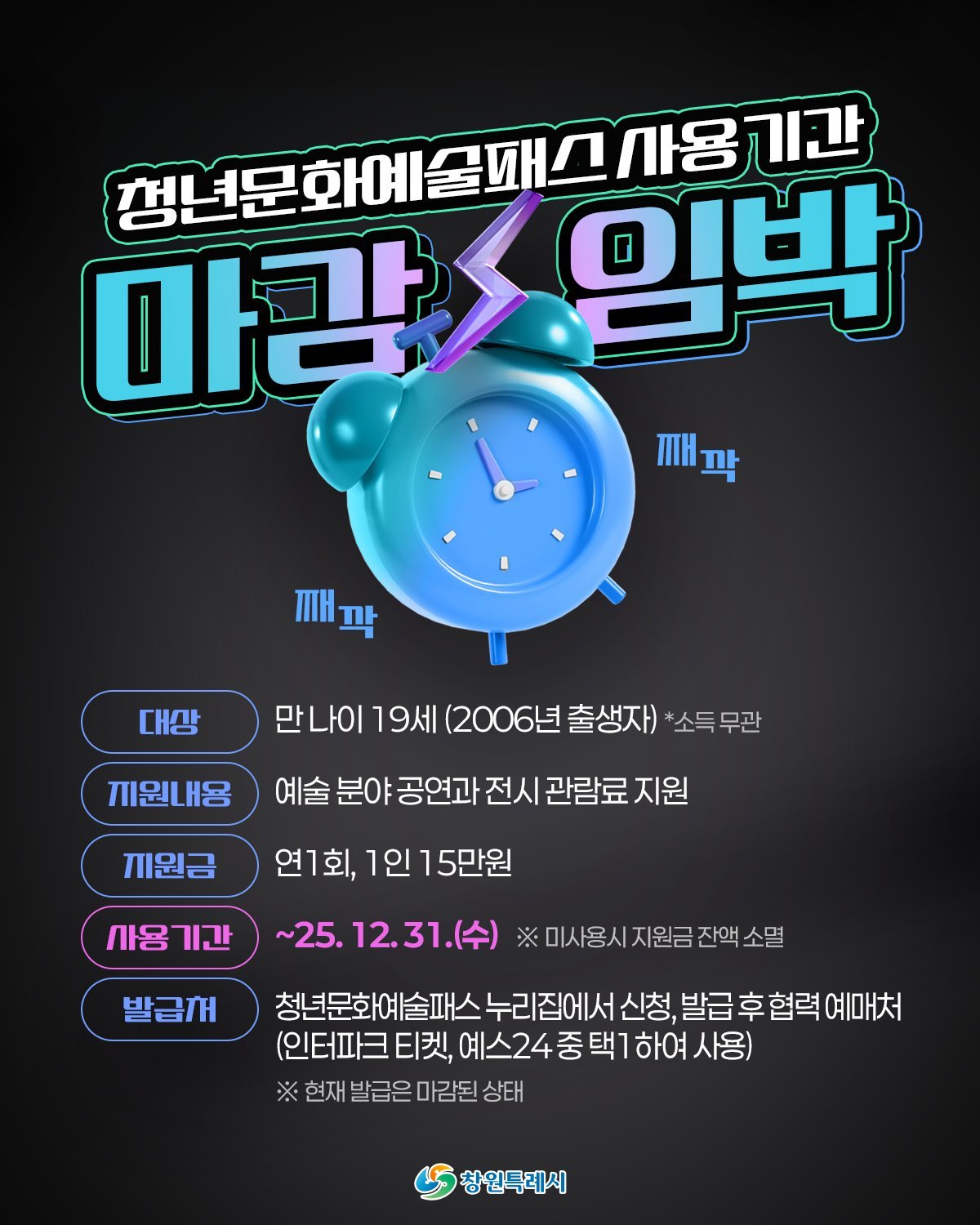 [한국Q뉴스] 창원특례시는 2006년생을 대상으로 지급한 ‘청년문화예술패스’포인트 사용기한이 올해 12월 31일 관람분까지로 종료됨에 따라, 아직 포인트를 사용하지 않은 청년들에게 서둘러 이용해 줄 것을 당부했다.