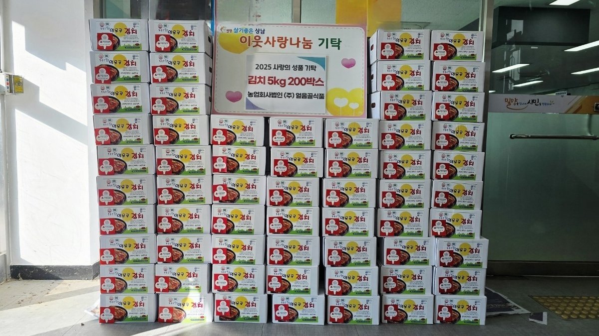 [한국Q뉴스] 밀양시 상남면에 소재한 농업회사법인 ㈜얼음골식품은 18일 지역 내 취약계층을 돕기 위해 김치 5kg 200박스를 상남면 행정복지센터에 기탁했다.