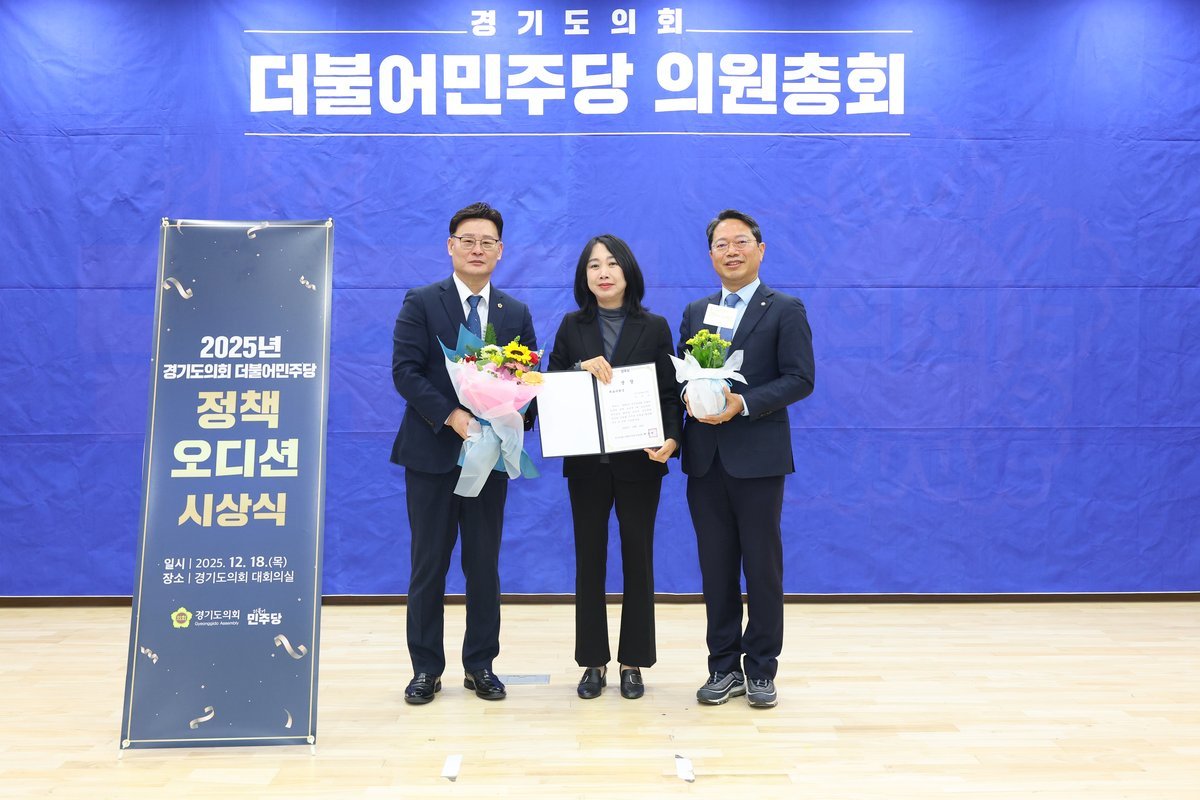 [한국Q뉴스] 경기도의회 경제노동위원회 이병숙 의원은 12월 18일 오전 도의회 대회의실에서 열린 「2025년 경기도의회 더불어민주당 정책오디션」에서 ‘경기도 여름 수변문화공원 어린이 문화예술 체험 활성화 방안’으로 대표의원상을 수상했다.