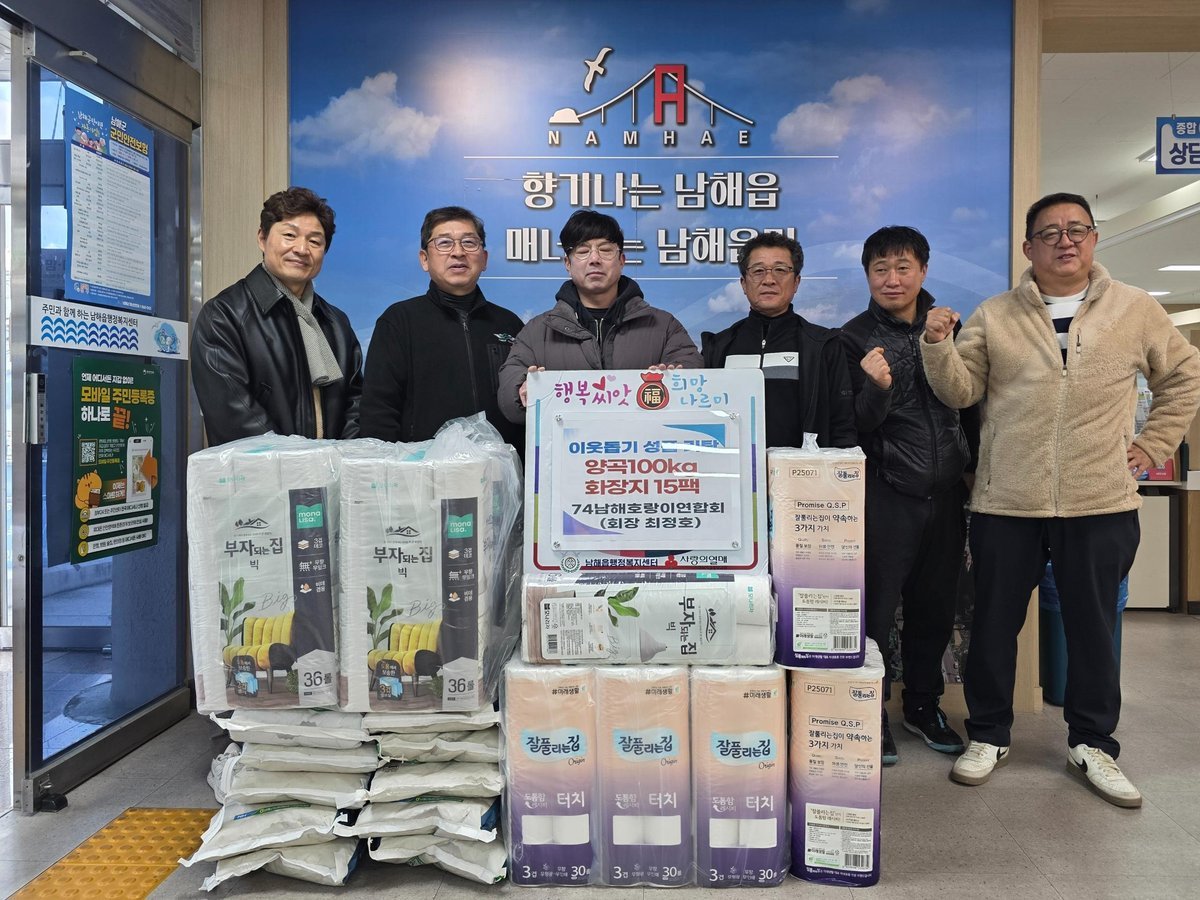 [한국Q뉴스] 남해읍 행정복지센터는 77남해호랑이연합회가 지난 19일, 지역 내 어려운 이웃들을 돕기 위해 쌀 10포와 화장지 15팩을 기탁했다고 밝혔다.
