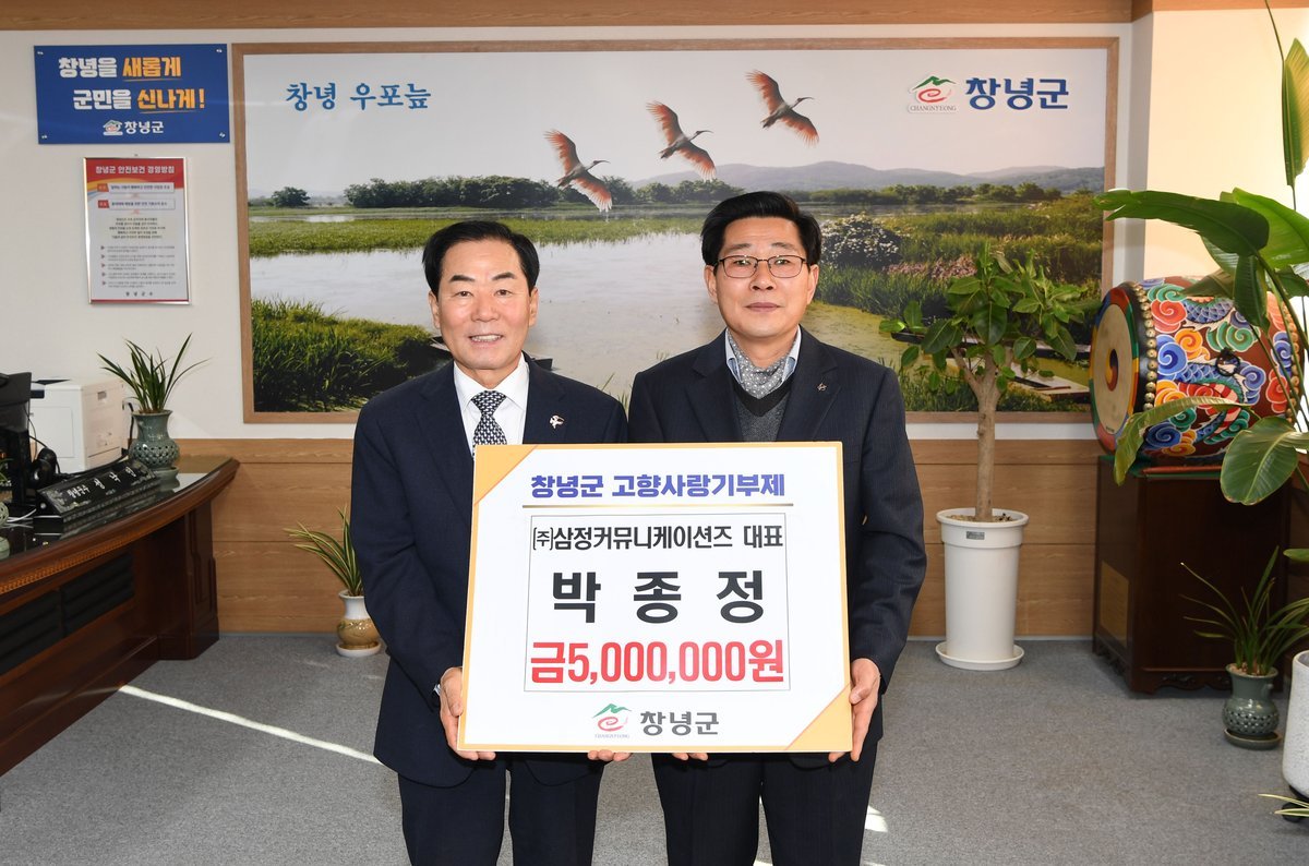 [한국Q뉴스] 창녕군은 지난 19일 성산면 출신 박종정 ㈜삼정커뮤니케이션즈 대표가 고향사랑기부제 활성화를 위해 고향사랑기부금 500만 원을 기탁했다고 밝혔다.