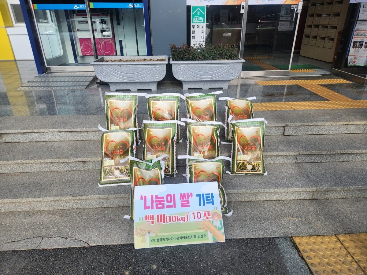 [한국Q뉴스] 한국통기타가수 문화예술협회는 지난 19일 초동면 내 한부모가정과 저소득 세대에 전달해 달라며 백미 10kg 10포를 기탁했다.