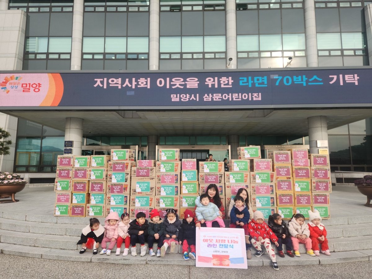 한편, 밀양시 삼문어린이집은 지역사회 이웃을 위한 라면 기탁을 4년째 이어오고 있으며, 어린이들의 건강한 성장을 위해 다양한 활동을 펼치고 있다.