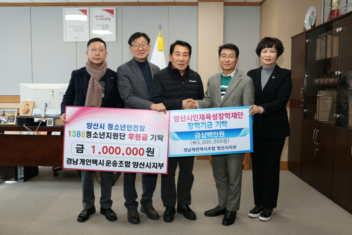 [한국Q뉴스] 경남개인택시운송조합 양산시지부는 26일 양산시를 방문해 후원금 100만원을 양산시청소년상담복지센터 1388청소년지원단에 기탁했다.