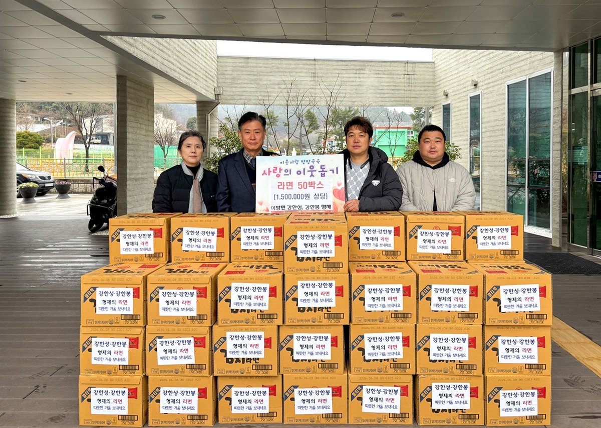 [한국Q뉴스] 창녕군 이방면은 지난 24일 이방면민 강한성·강한봉 형제가 연말을 맞아 어려운 이웃을 위해 라면 50박스를 기탁했다고 밝혔다.