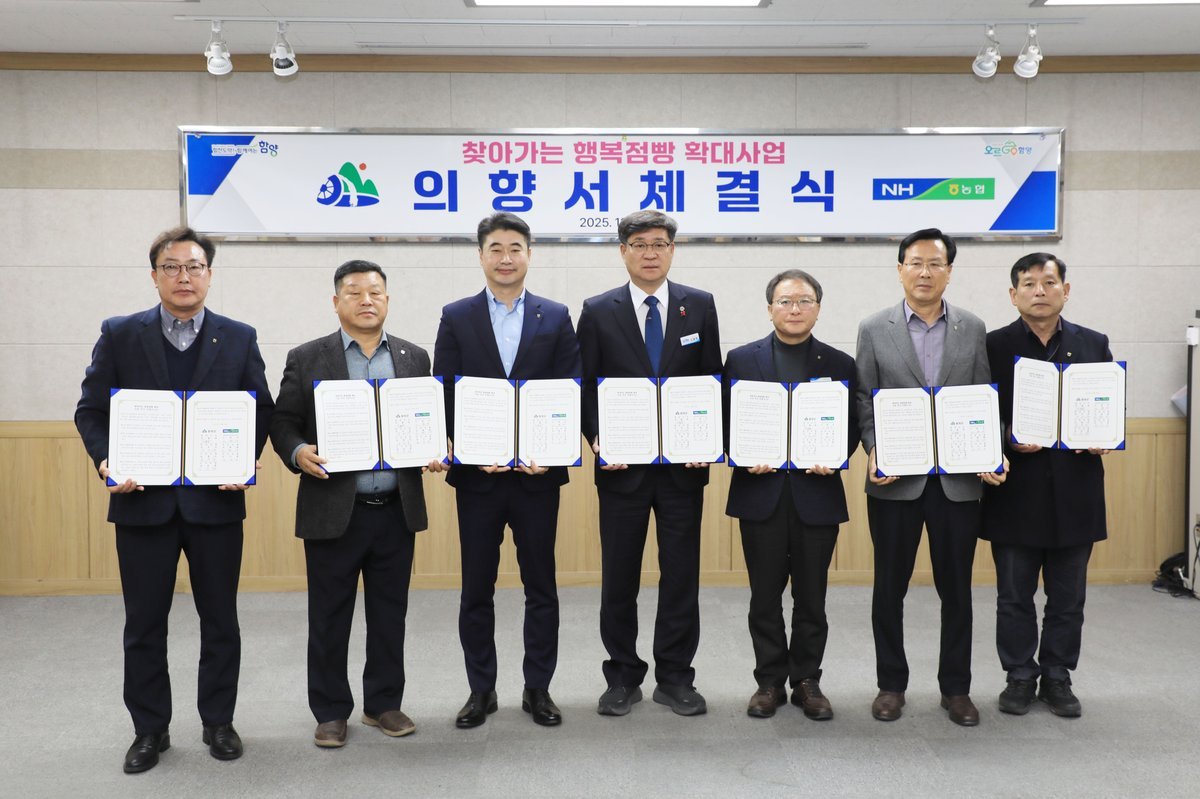 [한국Q뉴스] 함양군은 30일, 군청 소회의실에서 ‘찾아가는 행복점빵’확산을 위해 농협중앙회 함양군지부와 5개 지역농협이 참여하는 사업 추진 의향서 체결식을 가졌다.