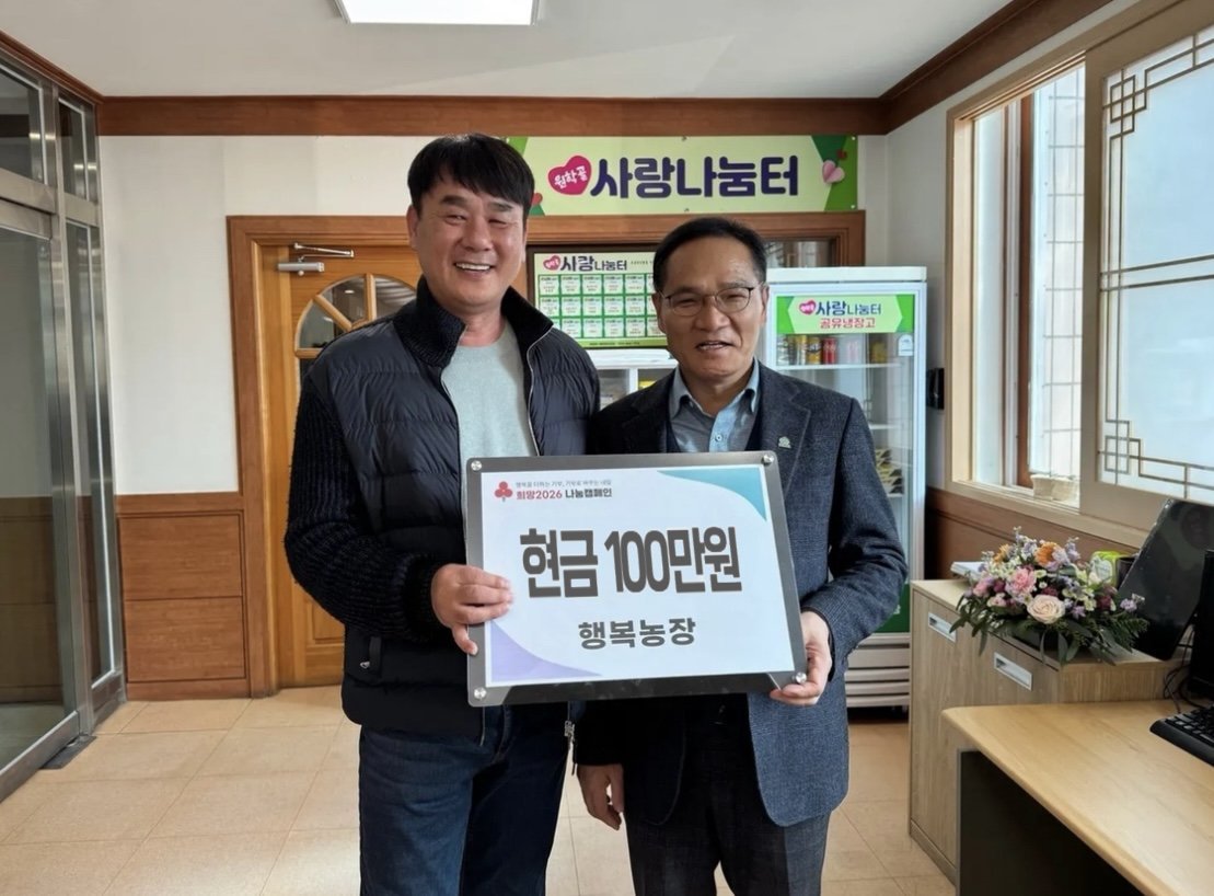 [한국Q뉴스] 거창군 위천면은 당산리에 소재한 행복농장에서 희망2026 나눔캠페인 성금으로 현금 100만원을 기탁했다고 밝혔다.