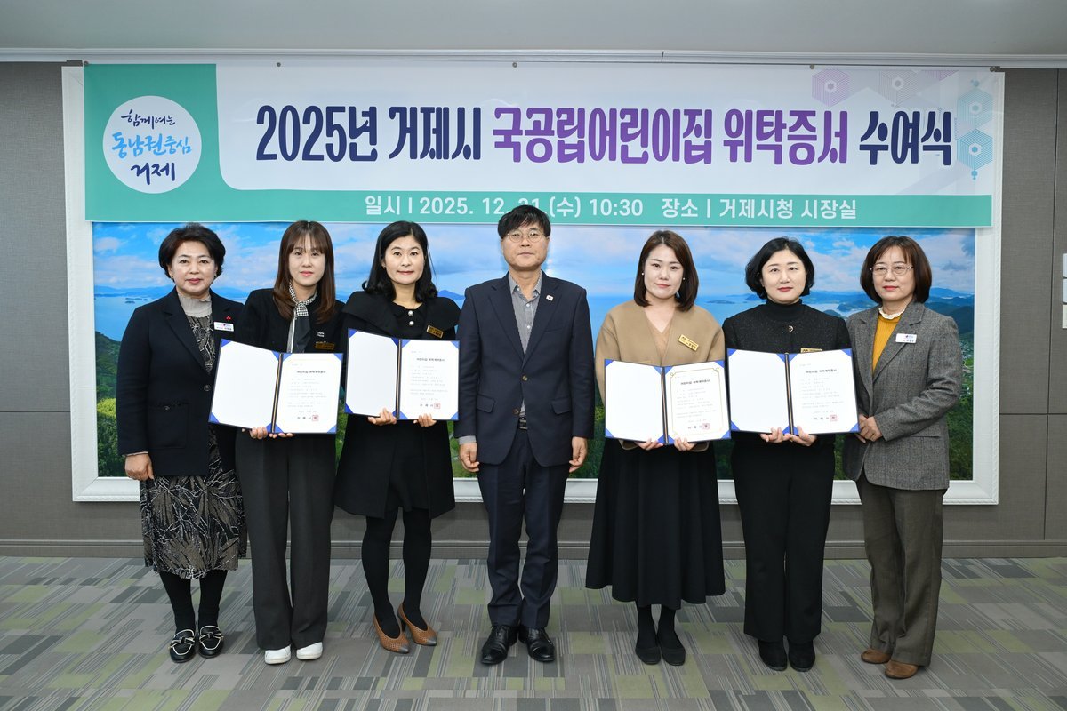 [한국Q뉴스] 거제시는 12월 31일, 시장실에서 국공립어린이집 수탁자로 선정된 어린이집에 위탁계약증서를 수여했다.