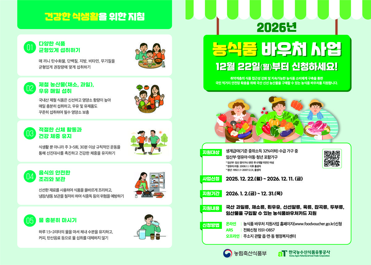 신규 신청은 주민등록 주소지 관할 읍·면·동 주민센터에 방문하거나 농식품바우처 홈페이지 h, ARS 등을 통해 신청이 가능하다.
