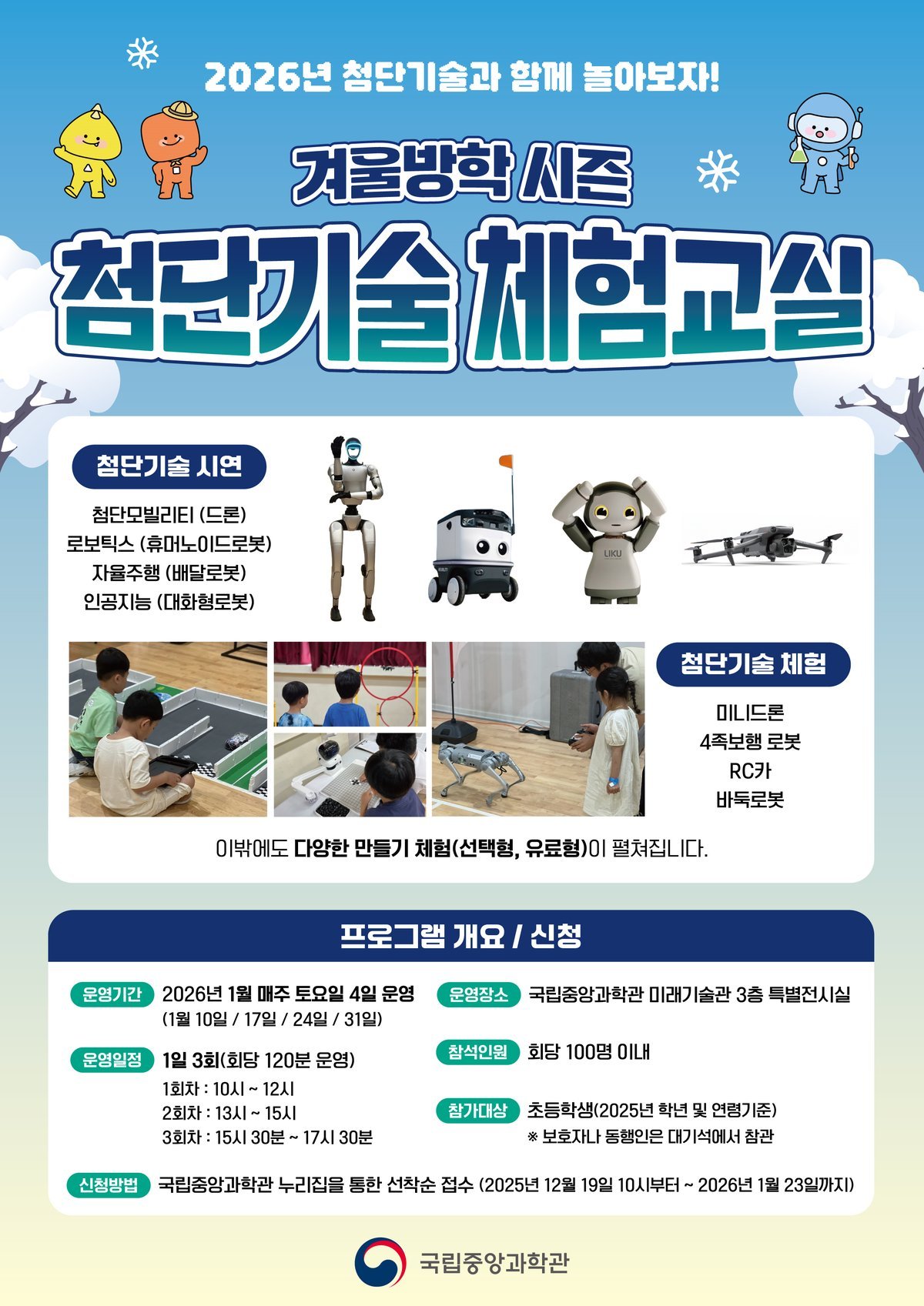 [한국Q뉴스] 국립중앙과학관은 겨울방학을 맞이하여 2026년 1월 중 매주 토요일 4일 동안「겨울방학 시즌 첨단기술 체험 교실」을 국립중앙과학관 미래 기술관 3층에서 운영한다고 밝혔다.