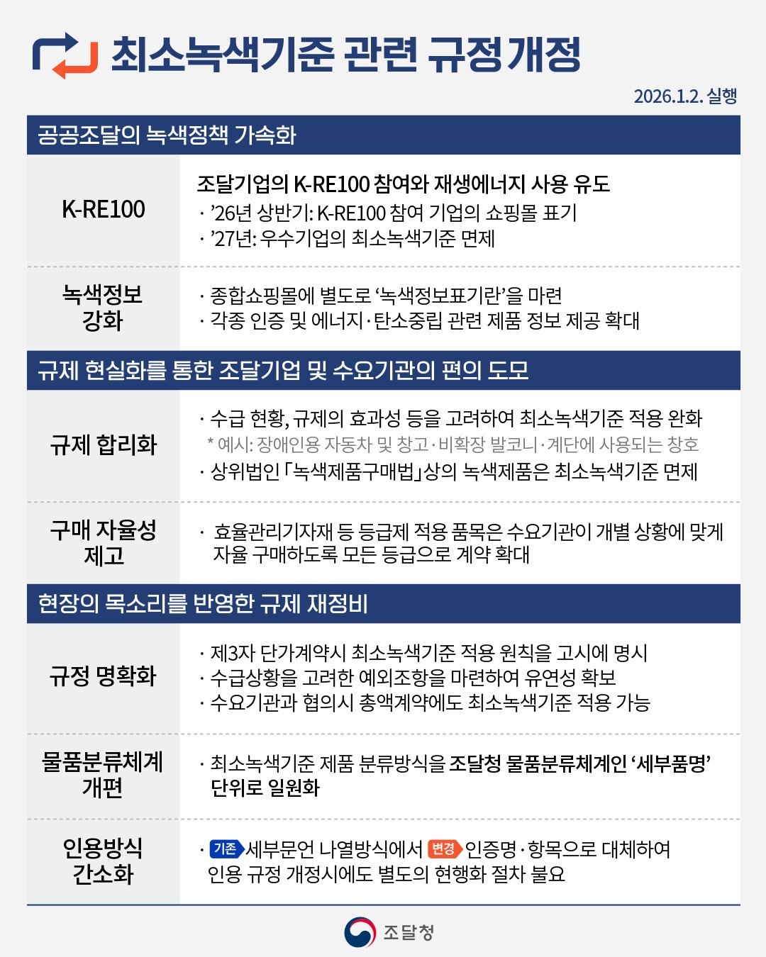 정부의 재생에너지 확대 및 탄소중립 정책 기조에 맞춰 조달 기업의 K-RE100 참여와 재생에너지 사용을 유도한다. 2026년 상반기부터는 K-RE100 참여 기업을 나라장터 쇼핑몰에 표시하고, 2027년부터 재생에너지 사용 비율을 높인 기업에 최소녹색기준 적용을 면제한다.